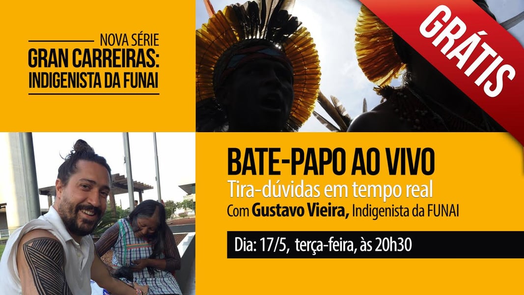 Estudando para o concurso da Fundação Nacional do Índio (Funai)? O Gran Cursos Online preparou mais um grande evento de nossa série “Gran Carreiras”, agora com o servidor público federal e Indigenista da Funai, Gustavo Vieira. No bate-papo, o nosso convidado, Gustavo, comentará um pouco sobre a sua experiência e a carreira na Funai. Os participantes também poderão enviar suas dúvidas em tempo-real pelo chat para serem respondidas no evento! A transmissão será ao vivo na terça-feira, 17 de maio, a partir das 20h30 (horário de Brasília).
