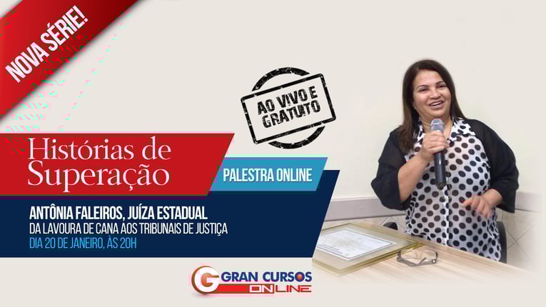 O Gran Cursos Online acaba de inaugurar sua mais nova série: Histórias de Superação. São palestras e entrevistas gratuitas com servidores públicos que, por meio de muito estudo e dedicação, conseguiram alcançar resultados extraordinários. O segundo episódio será protagonizado pela Juíza do Tribunal de Justiça da Bahia, Antônia Faleiros. A magistrada superou adversidades que pareciam impossíveis de ultrapassar. Aos 14 anos, trabalhava em um canavial no interior de Minas gerais. Aos 17, era empregada em Belo Horizonte e não tinha onde dormir. Durante 6 meses passou suas noites em um ponto de ônibus. Com muita dedicação, foi aprovada para Oficial de Justiça daquele estado, estudando com apostilas que foram jogadas no lixo por um curso preparatório. Antônia Faleiros formou-se em Direito e foi aprovada nos concursos de Procuradora do município de Belo Horizonte, Procuradora do Banco Central e Magistratura Estadual. Atualmente, ela é juíza da 1ª Vara Crime de Itabuna, no estado da Bahia. Na palestra, você conhecerá mais sobre essa grande história de sucesso e poderá aprender dicas valiosas para também conquistar a sonhada aprovação.