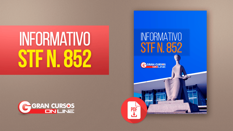 De grande relevância para os concursandos e para os alunos de Direito que participarão do Exame de Ordem, os informativos do Supremo Tribunal Federal, contém resumos de decisões proferidas pelo Tribunal elaborados a partir de notas tomadas nas sessões de julgamento das Turmas e do Plenário. O material disponibilizado é uma cópia fiel em PDF do Informativo de nº 852 disponibilizado pelo STF em seu site. A diagramação do arquivo visa apenas uma melhor qualidade de leitura dos textos.