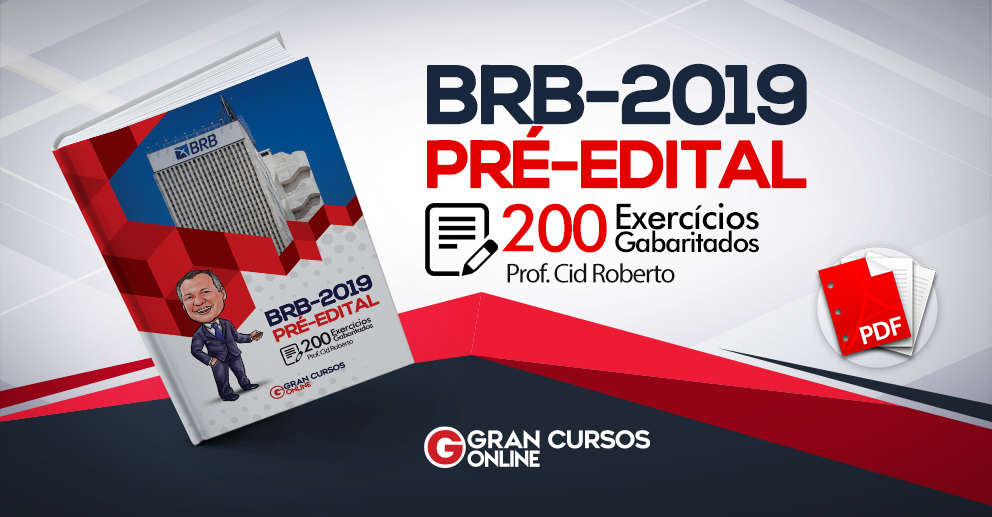A autorização para o concurso BRB foi anunciada pelo Governador do Distrito Federal, Ibaneis Rocha, em fevereiro, com 113 vagas imediatas para diversos cargos e 2 mil para a formação de cadastro reserva. O processo para escolha da banca organizadora deve ser finalizado nos próximos dias. Pensando nisso, o professor Cid Roberto e o Gran Cursos Online elaboraram uma apostila com 200 exercícios gabaritados para te auxiliar na conquista da tão sonhada vaga no Banco de Brasília.