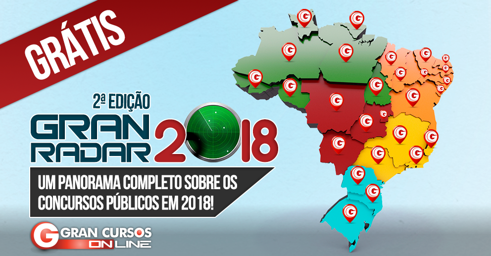 Faça o download do e-book Gran Radar e conheça o cenário geral dos concursos públicos que podem sair ainda este ano. Confira também uma análise completa do que esperar feita pelos mestres do Gran Cursos Online.