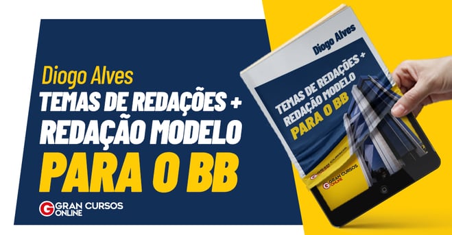 Com esse material, que é gratuito, você encontrará 9 propostas de temas de redação para o concurso do Banco do Brasil, além de uma redação modelo para cada tema, todos preparados pelo especialista e professor Diogo Alves. Assim, você tem uma ideia de como escrever um bom texto para cada tema a partir de um direcionamento profissional, de quem conhece o assunto.