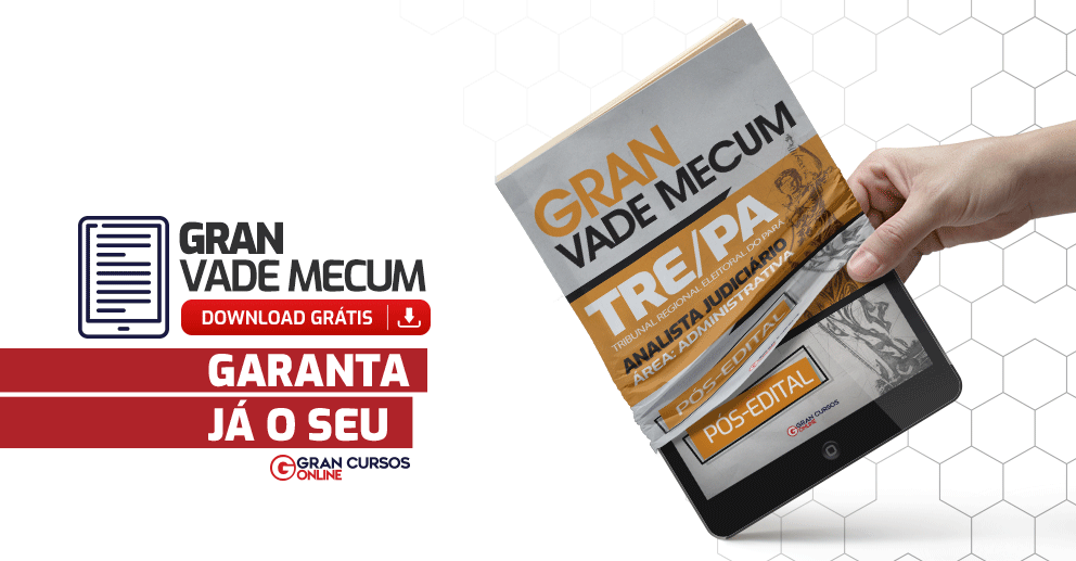 O Gran Cursos Online preparou o GRAN VADE MECUM– TRE/PA – Analista Judiciário – Área Administrativa , onde você encontrará a legislação que, muito provavelmente, será exigida nesse certame. Este material tem como objetivo ajudá-lo(a) na memorização dos detalhes de tais normas, de modo que você se prepare com antecedência, aliando essa teoria à prática por meio de resolução de questões de concursos anteriores sempre presentes em nossos cursos.