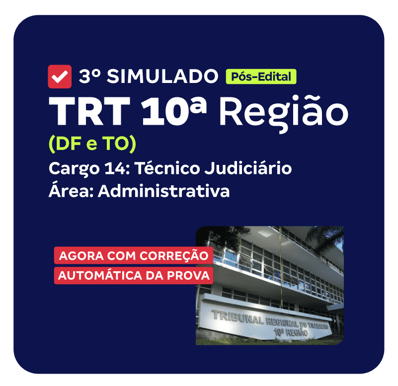 TRT 10ª Região (DF e TO) – 3º Simulado – Cargo 14: Técnico Judiciário – Área: Administrativa (Pós-Edital)